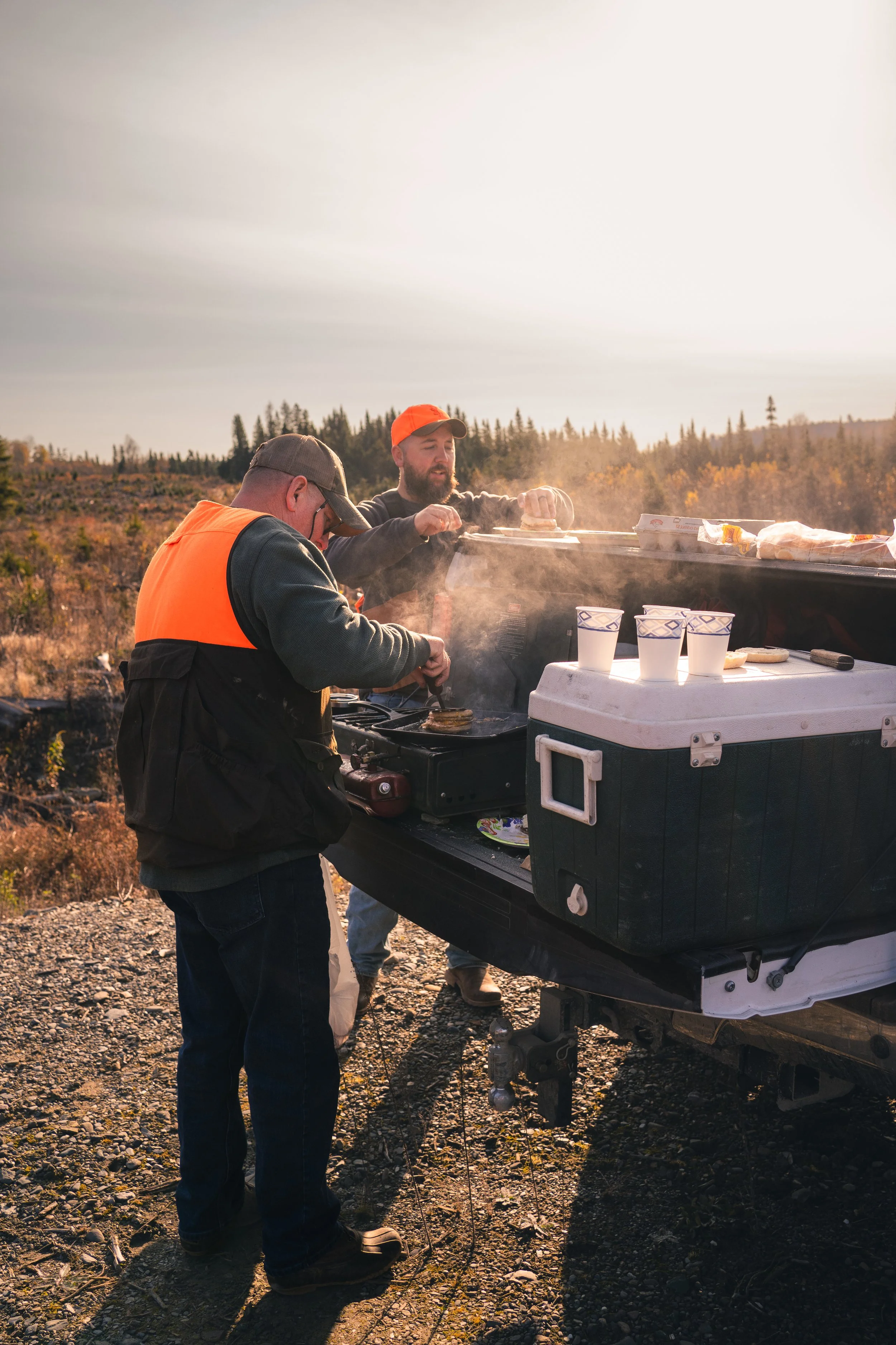 Two men preparing food on a grill outdoors in a natural setting with trees and mountains in the background, with a cooler and cups nearby. View fullsize