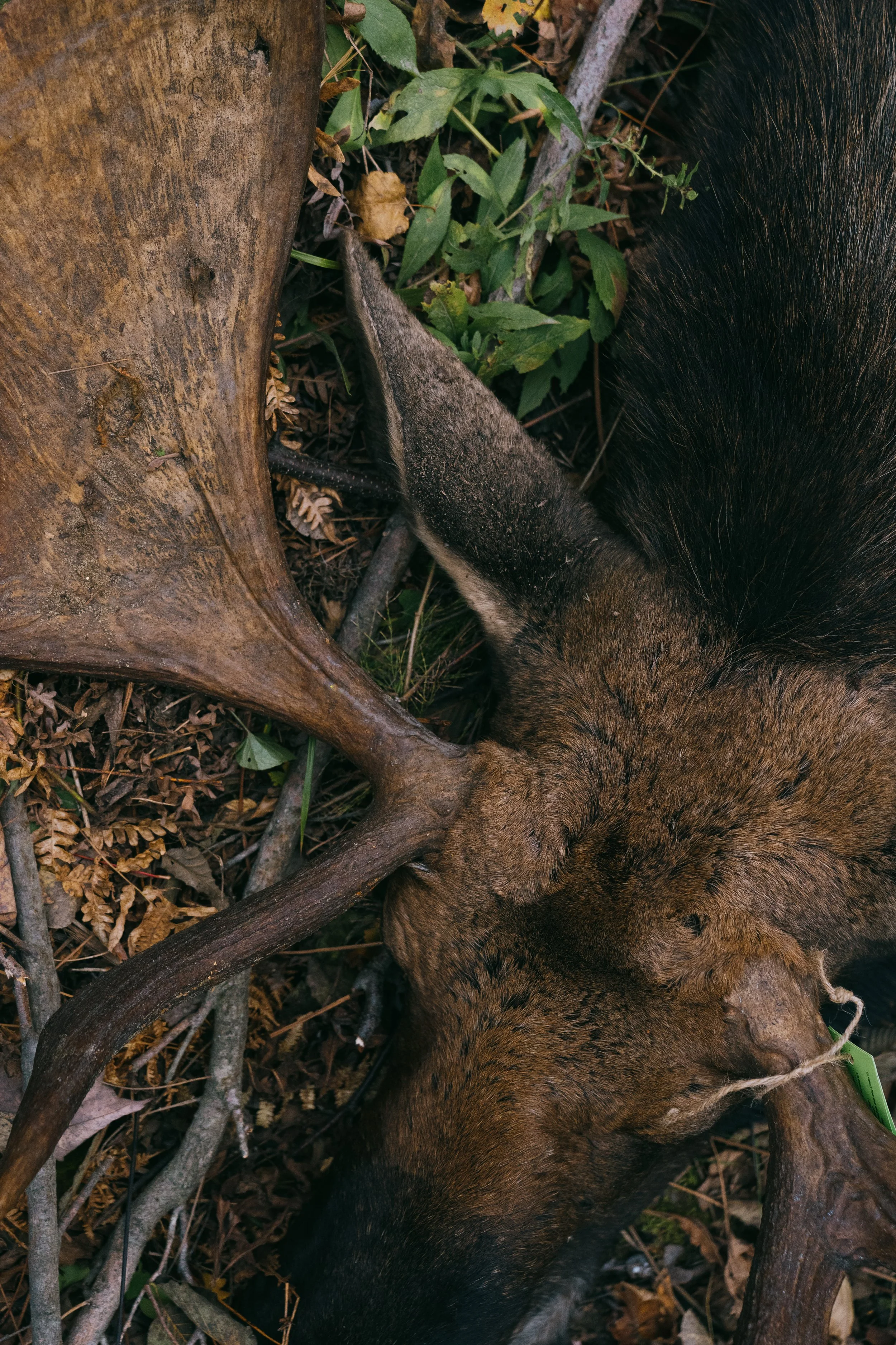 A male moose with large antlers lying on the ground among leaves, sticks, and greenery. View fullsize