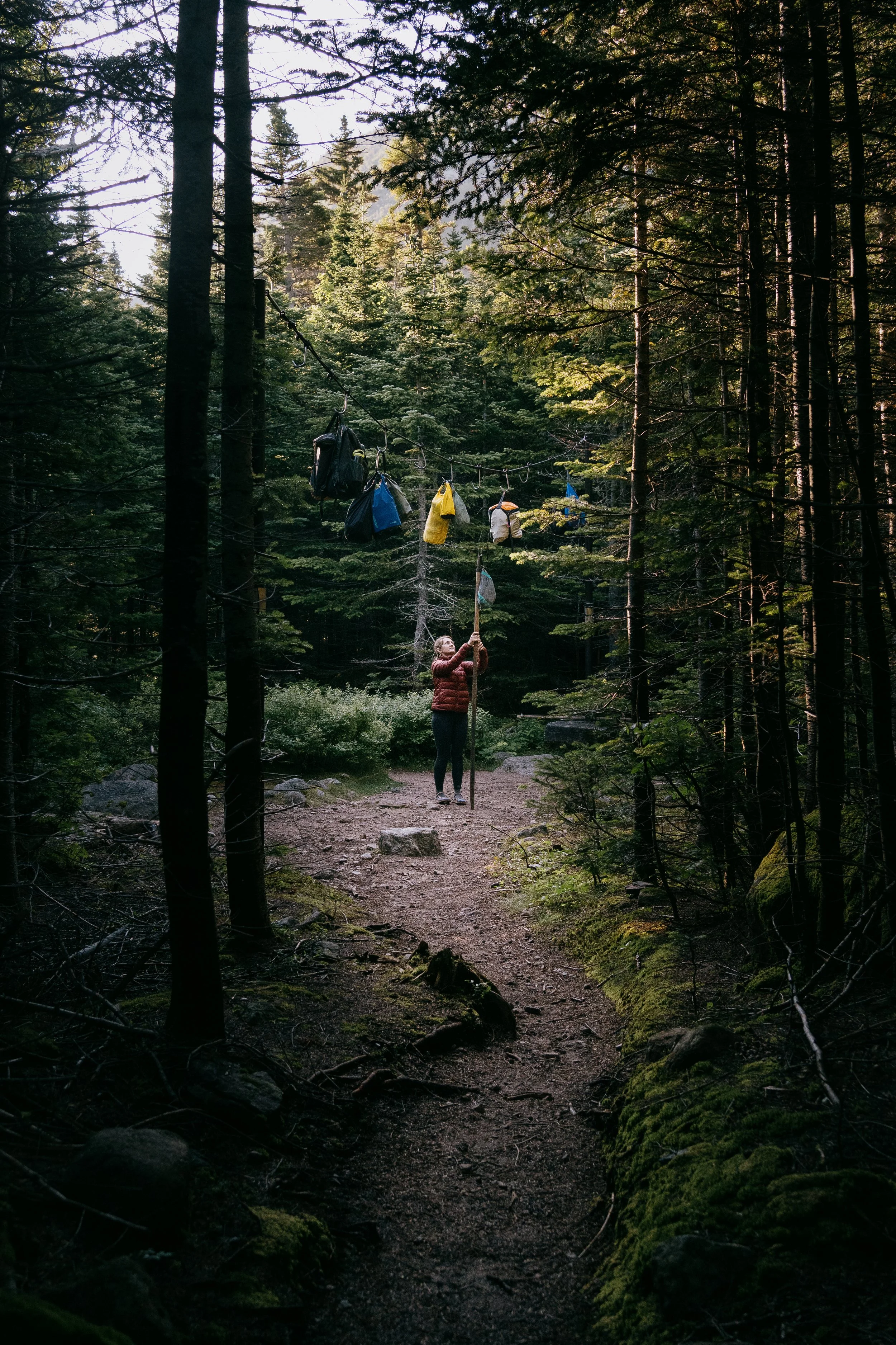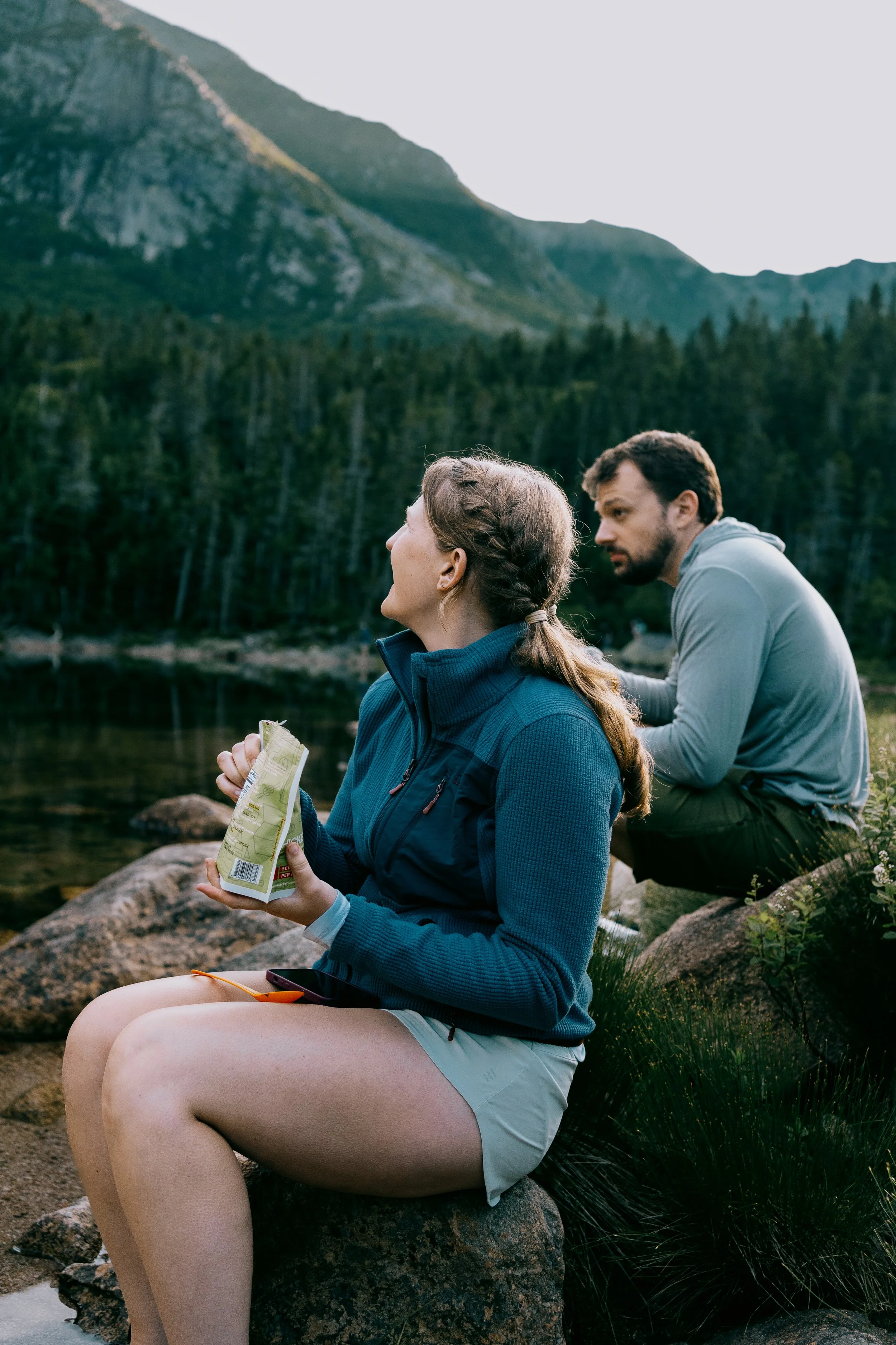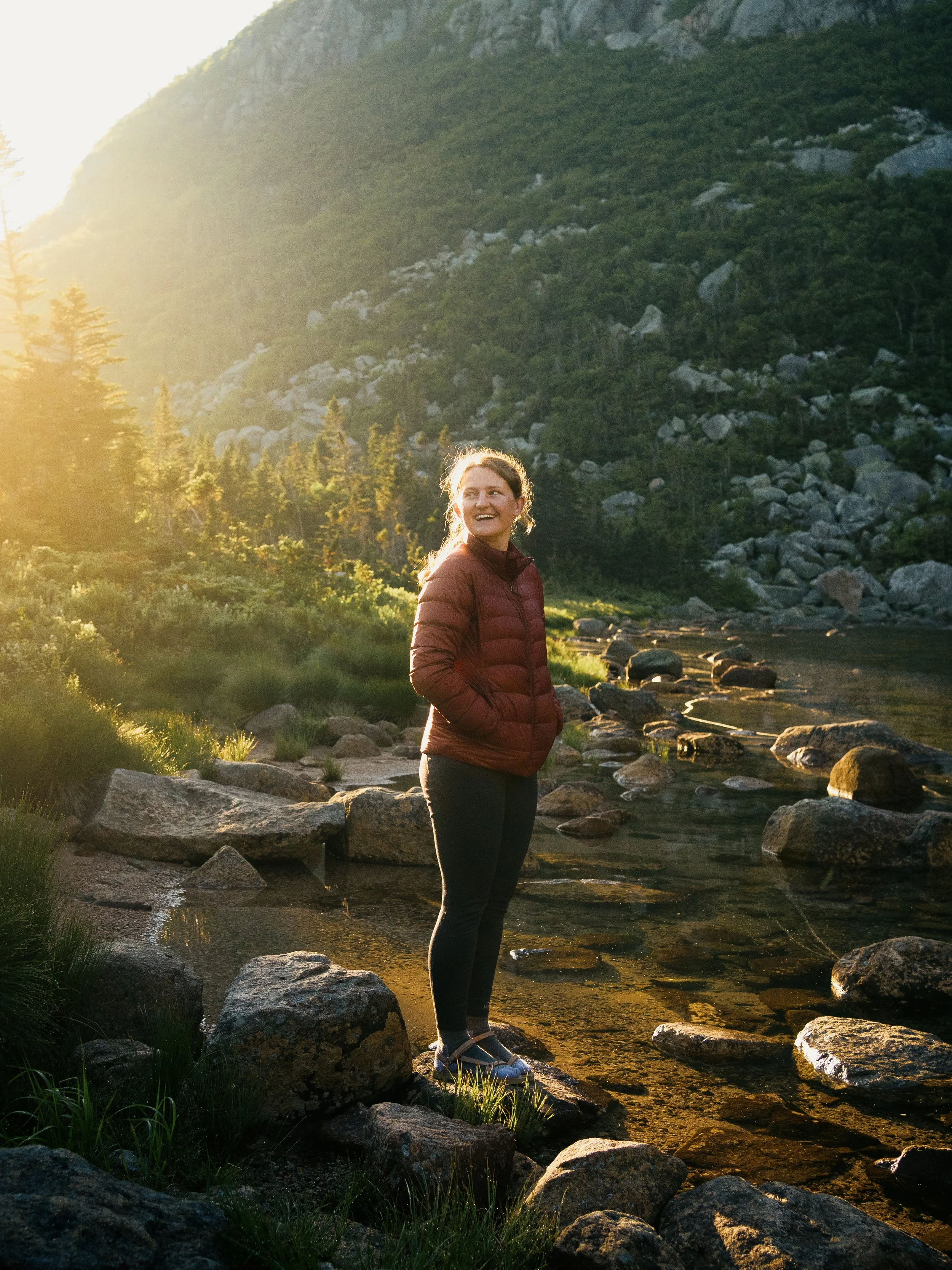 Woman smiling in a red jacket and black leggings standing on rocks in a mountain river at sunset.