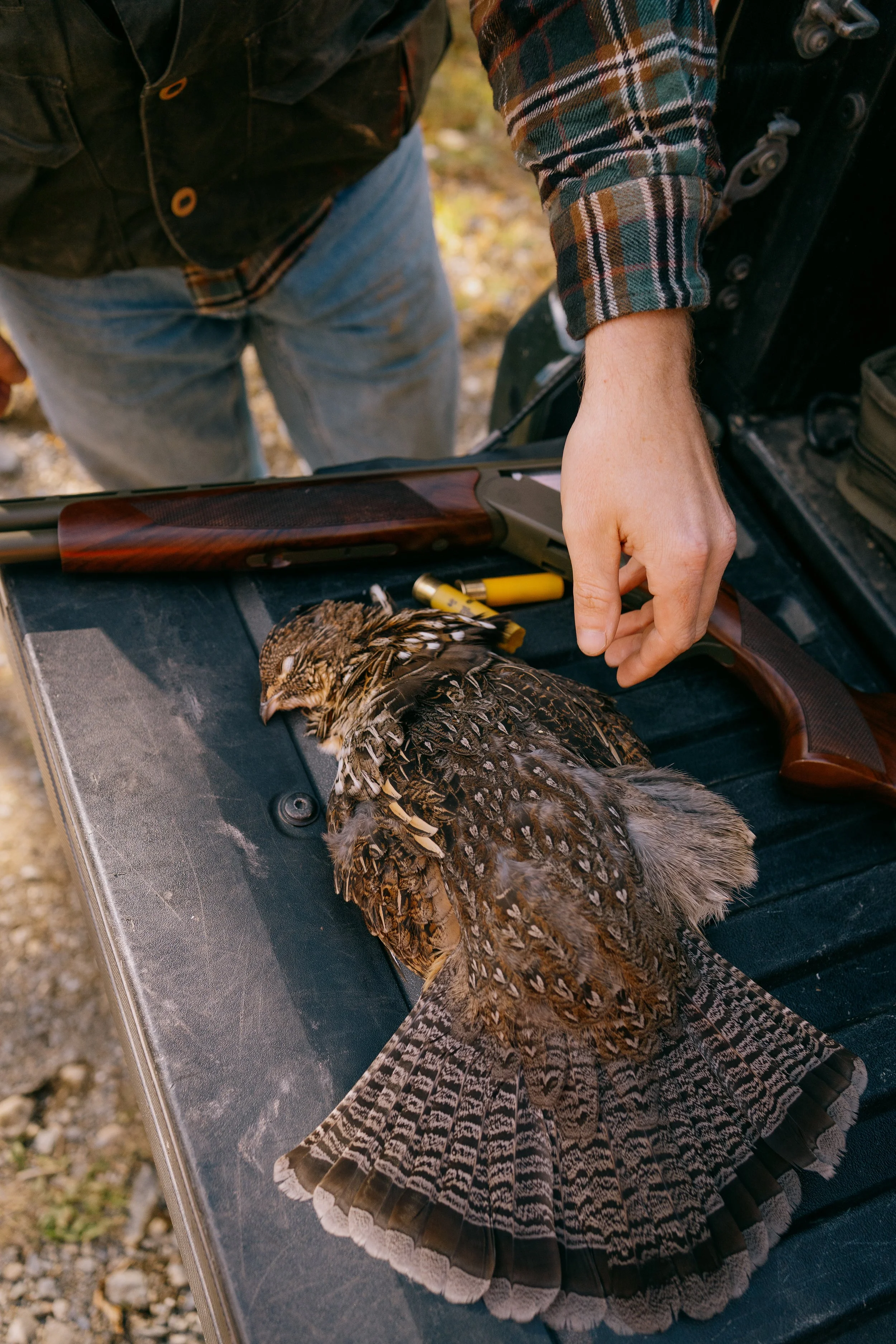 A dead bird, likely a grouse, lying on a black surface next to a shotgun, with a person in a plaid shirt and vest preparing to field dress or examine it. View fullsize